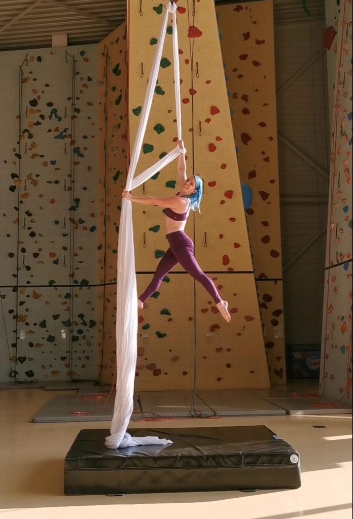Danach findet das gemeinsame Warm Up statt welches von mir geführt wird. Nun sind wir bereit für das Vertikaltuch. Ich werde dir verschiedene Tricks, Figuren, Spins, Combos, sowie Drops unterrichten. In den letzten 5-10 Minuten machen wir gemeinsam ein Cool Down und räumen als Abschluss zusammen auf.