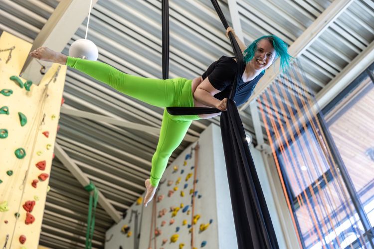 - Du bist mit mir zusammen am Tuch, ich zeige dir gleich vor und unterrichte dich. Die Hälfte der Zeit trainiere ich zwischendurch für mich, zusammen trainieren wir die doppelte Zeit.